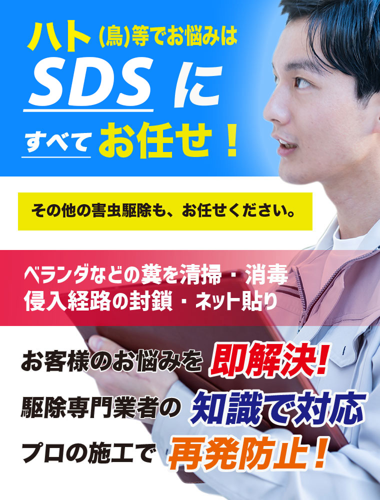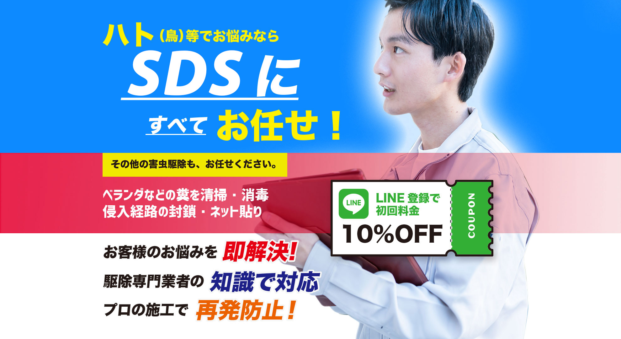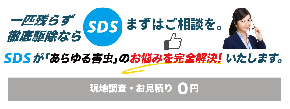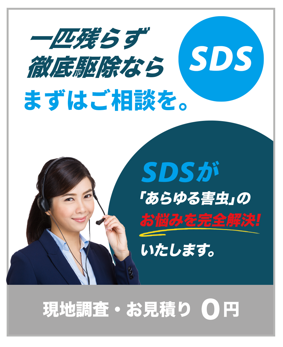 害虫・害獣駆除サービスを利用した経験がなければ、見積もりの金額が適正かすらわからないものです。残念なことに、お客様に知識がないことにつけ込んで、契約後に追加料金の発生する施工を無理やり行う業者も存在しています。また、集客のみを行い施行は他社に依頼する「紹介業者」に依頼すると、その分の紹介手数料が発生する点にも要注意です。 SDSは集客から施工のすべてを自社で行っているので、リーズナブルに駆除ができます。お客様のご予算に応じた駆除プランのご提案もできますので、まずはお話をお聞かせください!