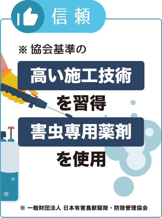 SDSが駆除の際に使用している薬剤は、市販品ではありません。私たちが駆除に使っている薬剤は、SDSも加盟している一般社団法人日本有害鳥獣駆除・防除管理協会が独自に作り上げた薬剤です。 プロの害虫駆除業者でも、市販品を使用して追い出すケースはよくあります。しかし、私たちはお客様に安心していただくために、独自の薬剤を使うように決めました。 私たちが使う薬剤の市販品との大きな違いは、効力と安全性です。短時間でも効き目が感じられる駆除力の高さと、日常生活を営むご自宅や大切なご家族への悪影響のなさをしっかりと両立させました。 単に駆除するだけではなく、サービスを受けることで心の底から安心して暮らしていただけるように心がけています。